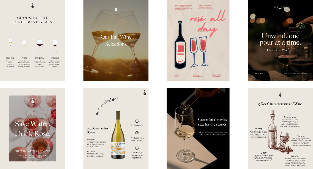 We design custom graphics for both feed and stories, focused on educating the audience about wine, highlighting curated selections, promoting weekly events, showcasing new arrivals, and more.